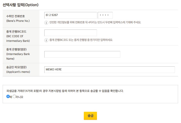 3. "중계수수료"는 송금자/수취인 부담 중에 선택을 해야 하는데,