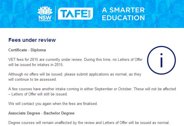 그래서 TAFE NSW에 직접 컨택을 해서 알아보니, 현재 2015학년도 학비를 재 검토하여 산정하는 중이기 때문에 자연스럽게 입학허가서 발행이 전반적으로 모든 오퍼발행이 늦어지고 있다고 하더라구요.