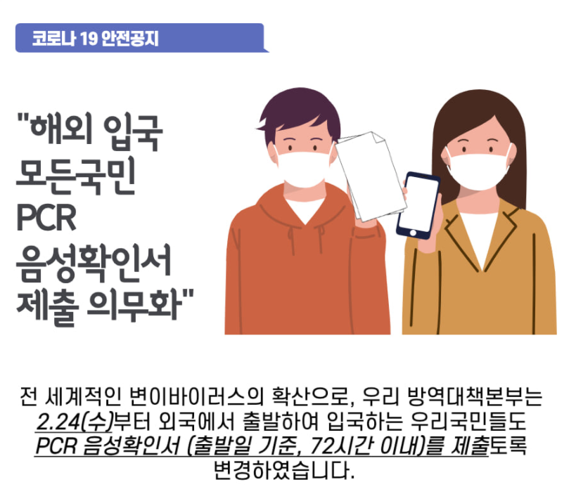 전파력이 높은 코로나19 변이 바이러스의 전 세계적 확산에 따라, 해외에서 우리나라에 입국하는 모든 내국인(대한민국 국민)에 대해 PCR 음성확인서 제출 의무화를 아래와 같이 시행합니다.