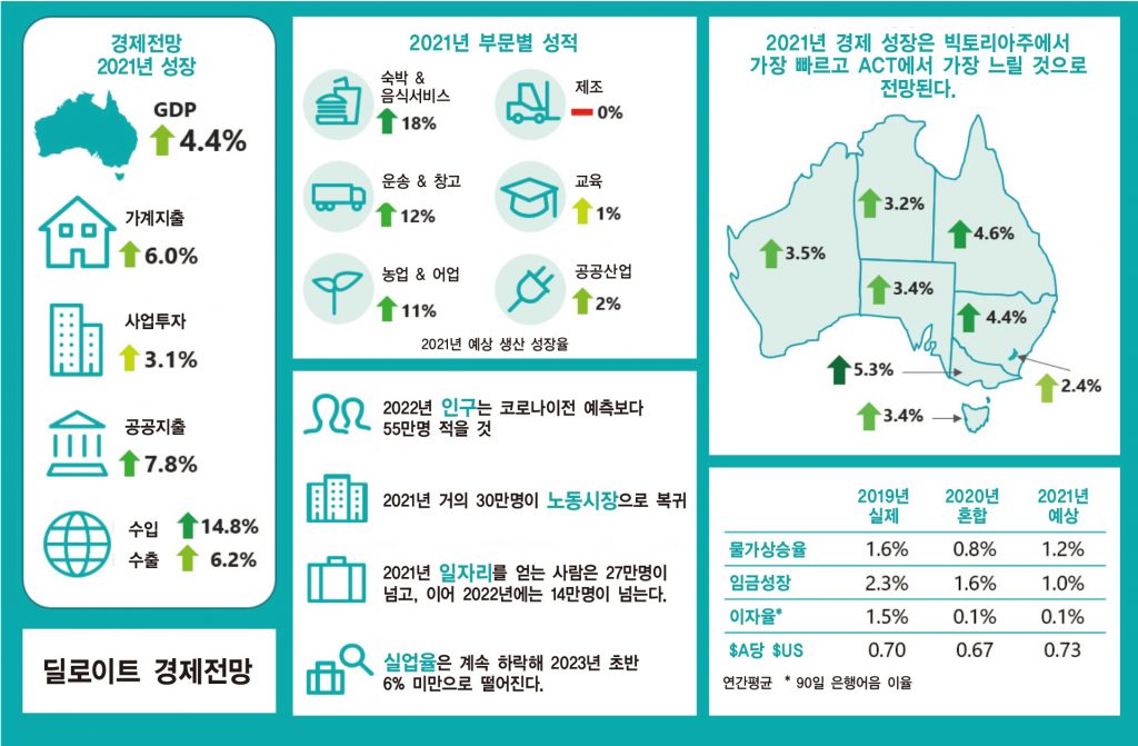 지난해 경제 마이너스는 봉쇄와 국경 폐쇄로 주로 야기되어 항공사, 공항, 관광계, 유학생, 카페 및 식당, 숙박업소, 소매, 영화관, 오락 부문이 가장 큰 타격을 입었습니다. 그러나 호주에서 코로나19 규제가 완화, 해제되고 주경계가 문을 열면서 딜로이트는 호주 경제가 크게 반등할 것이라고 기대하고 있습니다.