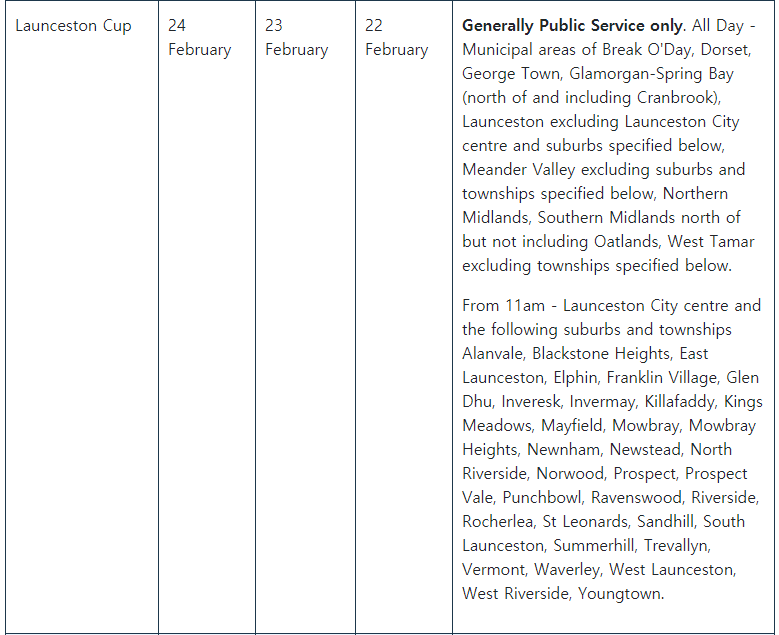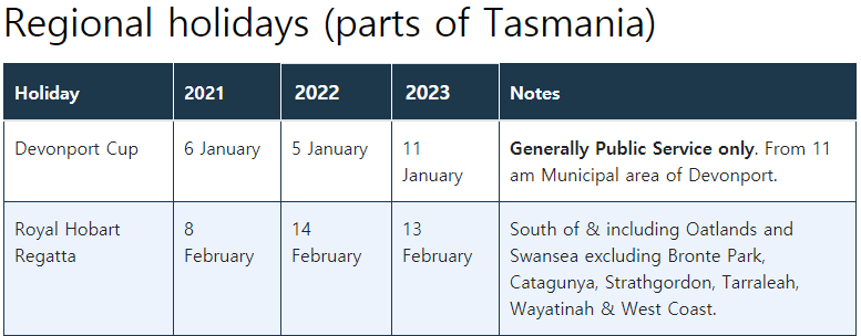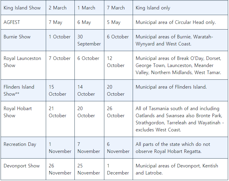 다음 5월 7일(금) AGFEST 타즈매니아 농업박람회는 Circular head 지역에만 해당하는 공휴일이고요. 10월 21일(화) Royal Hobart Showsms 호바트 지역에만 해당하는 공휴일입니다. 그밖에 Tasmania 자료는 위 표를 참고해주세요.