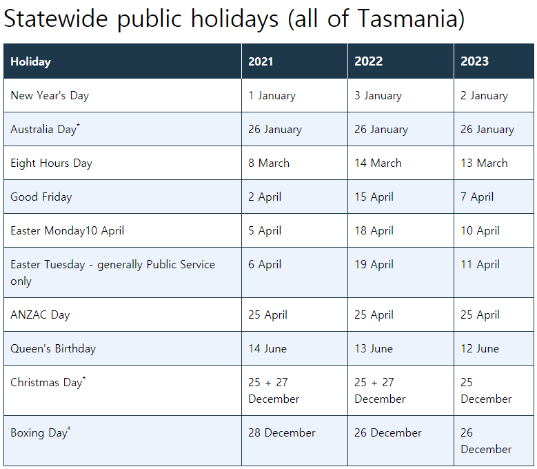 마지막 대망의 Tasmania Public Holidays 입니다. 사실 타즈매니아 공휴일은 정리하다가 포기하고 Tasmanian Government Work Safe 사이트에서 자료를 가지고 왔습니다.