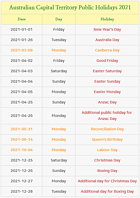 이번에는 호주의 수도 캔버라가 있는 ACT 입니다. ACT도 2021년 4월 26일 월요일을 안작데이 대체공휴일로 지정했습니다. 그러고보니 NSW, VIC, TAS 주를 제외한 나머지 States에서는 안작데이 대체공휴일을 지정하고 있네요.