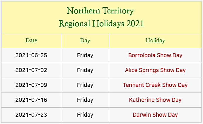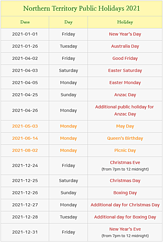 NT주의 5월 3일 May Day는 근로자의 날로 Labour Day이며, 8월 2일 Picnic Day는 말그대로 그냥 피크닉데이로 특별한 의미가 따로 있는것 같지는 않네요. 2021년 Regional Holidays를 제외한 NT주의 공휴일은 총 16일로 토,일을 제외한 휴일은 11일 입니다.