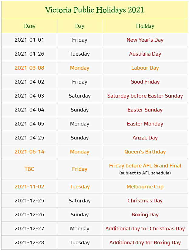 빅토리아 주에서는 호주 국민 스포츠라고 불리는 AFL(Australia Football League) 결승전이 있는 전 날을 공휴일로 지정했습니다. 공휴일 날짜에 표기된 TBC란 To be confirmed의 약자로 추후 AFL 스케줄에 따라 공휴일이 정해질 예정입니다.
