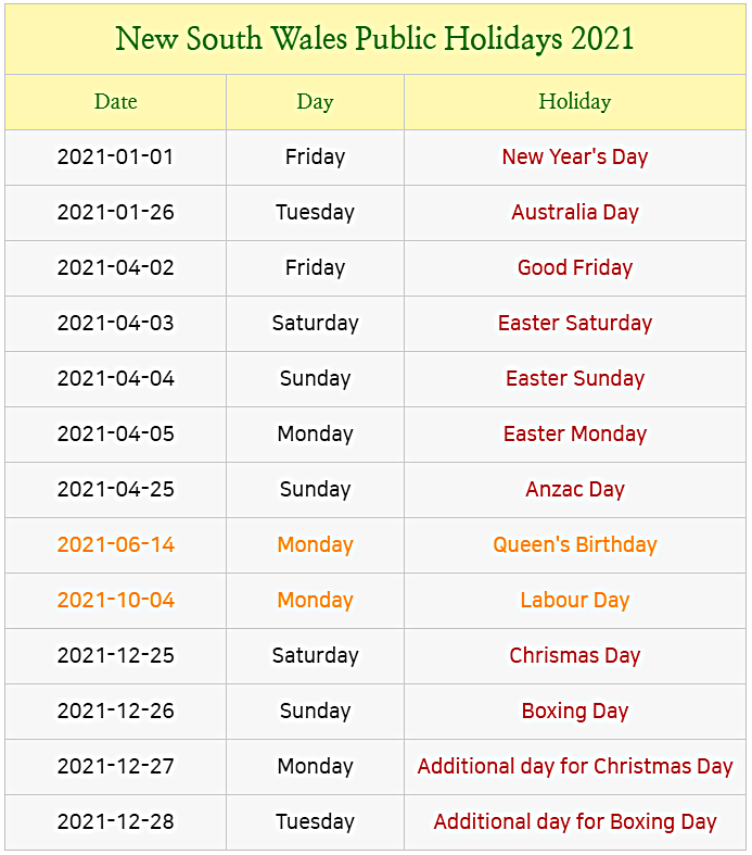 NSW 지역은 호주 전 지역에서 가장 공휴일 일수가 적은 주로, 2021년 총 13일의 공휴일 중 토요일, 일요일을 제외한 8일의 휴일이 있습니다. State Public Holiday로는 Queen's Birthday와 Labour Day가 있네요.