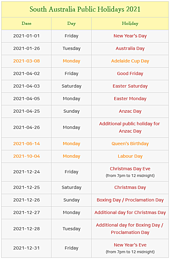 호주 사람들이 가장 좋아하는 스포츠 중 하나가 경마라고 하는데요. 아니나 다를까 빅토리아주에 이어 SA주에서도 남호주의 대표 경마대회인 Adelaide Cup 을 공휴일로 지정했습니다. 호주사람들에 경마 사랑이 대단하죠? 2021년 SA주는 총 16일의 공휴일이 있고 토,일은 제외한면 12일의 휴일이 있습니다.