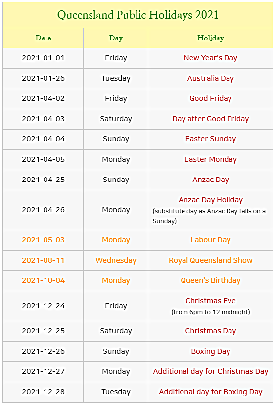 2021년 퀸즐랜드주 휴업일수는 대체 공휴일은 포함한 총 16일의 공휴일 중에서 토,일은 제외한면 11일의 휴일이 있습니다.