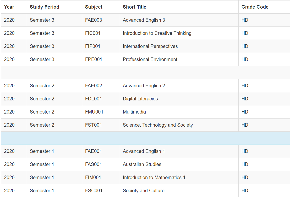 감사하게도, 3학기 전 과목 HD로 졸업하게 되었습니다. 제가 수강한 과목들 또한 위 성적표에 나와있는데요, Extended Course는 1학기는 모두 필수 과목, 2학기 2과목, 3학기 1과목을 선택할 수 있습니다. 원래는 저 4과목 제외 Academic Skills라고 해서 성적이 매겨지지 않는 과목이 하나 더 있습니다. 혹시 UTS Foundation 과정을 듣기로 예정되어 있는 분들은 따로 질문해주시면 학기별 과목 선택이나 과제 관련 조언(?)을 해드리겠습니다..ㅎㅎ
