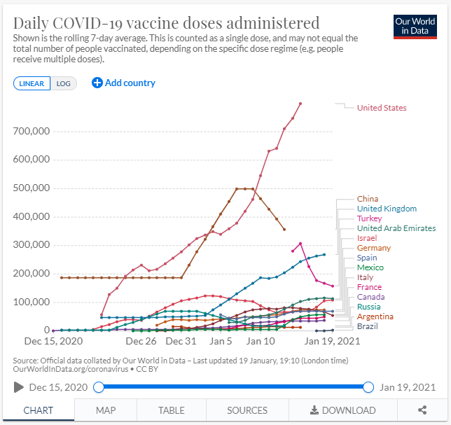 1월 13일 기준 코로나19 백신 접종이 진행 중인 나라는 미국, 중국, 러시아, 영국을 포함 46개국으로 이 중 유럽 국가가 30개국이 넘어 가장 많습니다. 아프리카에서는 25명이 백신 접종을 받은 기니가 유일합니다. 그리고 다른 지역보다 상대적으로 코로나19 확산 억제에 성공적인 아시아 지역에서는 백신 개발에 가장 적극적이었던 중국이 유일하며 이스라엘, 아랍에미리트, 사우디아라비아를 포함 중동 6개국에서도 백신 접종이 시작됐습니다.