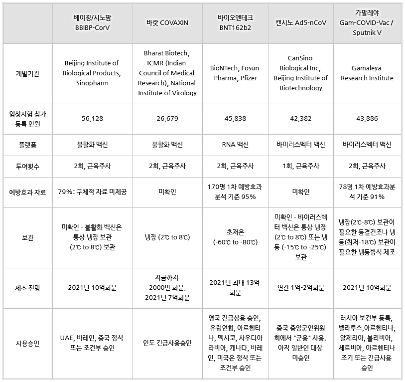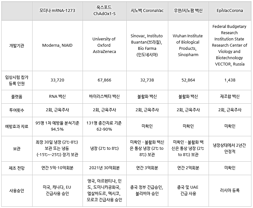 현재 투여 중인 코로나19 백신은 3상을 통해 예방효과가 발표된 것과 그렇지 않은 백신들이 섞여 있으며, 1월 12일 기준 긴급사용이나 조건부 승인 또는 제한적 사용이 허가된 백신은 총 10종이 있습니다.