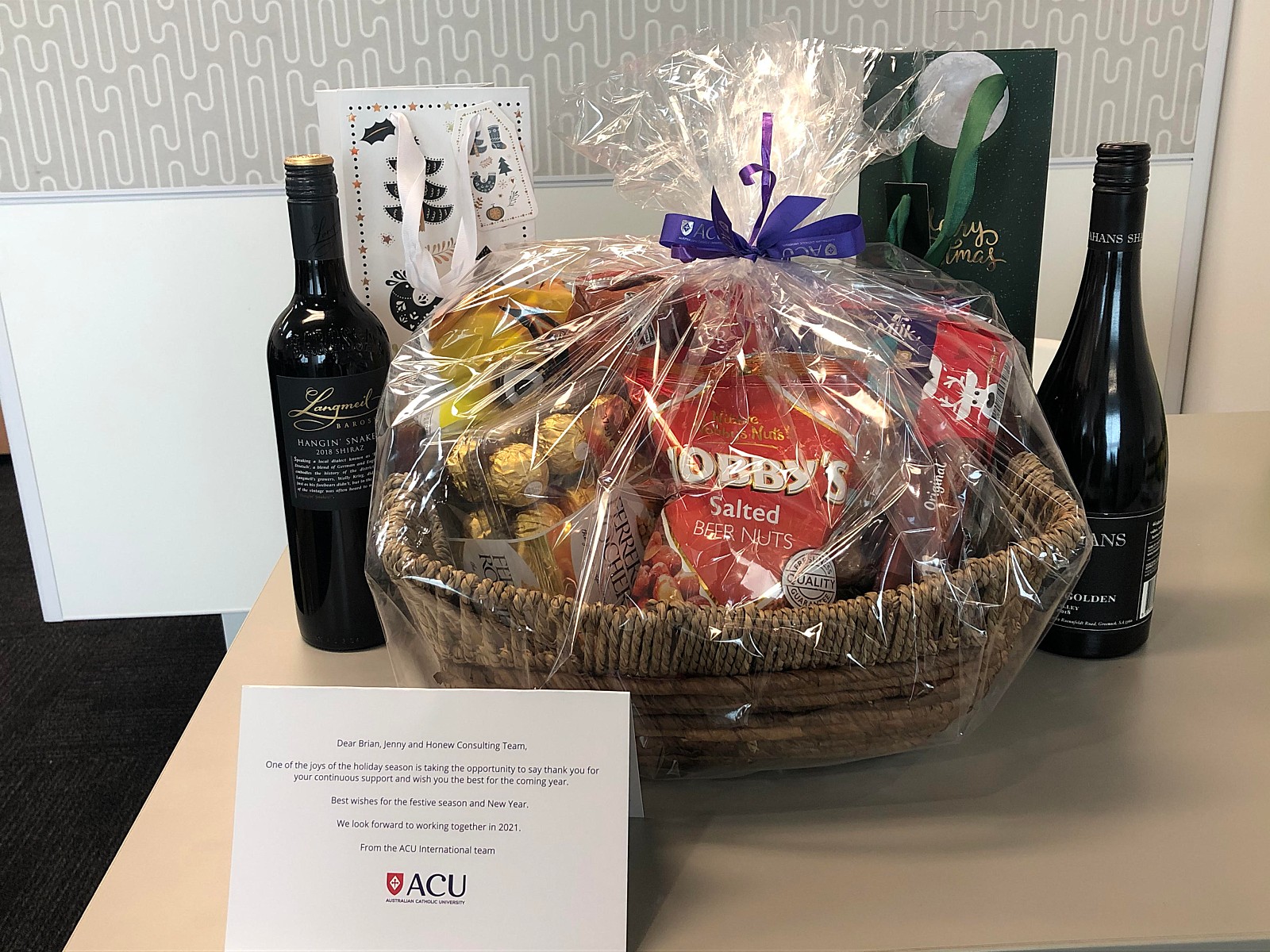 크리스마스와 새해를 기념하는 편지와 함께 큰 바구니에 맛있는 간식거리들이