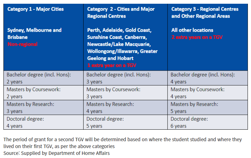 가장 큰 변화는 지방 지역에서 학업을 유지하며 거주하고 있는 졸업생 비자 소지자에게는 두번째 졸업생 비자 신청 자격이 주어진다는 것입니다. 두번째 졸업생 비자를 받은 후에도 지방지역에 남아있어야 한다는 조건인데 시드니와 멜번, 브리즈번의 유학생들은 기존의 방식대로 학부 졸업생의 경우 2년의 졸업생 비자를 받을 수 있었던 것에 비해 지방 지역의 대도시, 즉 퍼스, 애들레이드, 골드코스트, 캔버라, 선샤인코스트, 뉴캐슬, 울릉공, 그레이터 질롱, 호바트 등에서 유학한 졸업생은 추가 1년이 연장 가능해지면서 3년 간의 졸업생 비자를 그리고 지방의 대도시를 제외한 지역에서 유학한 학생은 추가로 2년이 늘어난 4년간 졸업생 비자로 생활할 수 있게 됩니다. 지방 지역도 이렇게 2개의 카테고리로 나눠서 더 세부적으로 추가 연장 혜택을 마련한 것으로 보여집니다.
