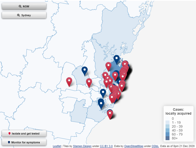 ※ 기타 시드니 CBD 카페, 쇼핑센터 등에도 확진자가 다녀간 것으로 나타났으며, 확진자 동선 관련 아래 사이트에서 지속 업데이트 중입니다.