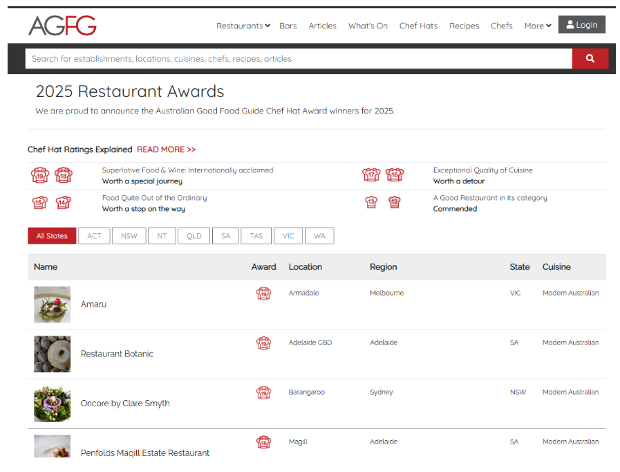 AGFG(Australian Good Food Guide)는 호주의 대표 미식 평가 기관으로 1977년에 가이드가 처음으로 발간되고 1982년부터 전국의 뛰어난 셰프들에게 수여되었다고 합니다. 호주 전역의 레스토랑, 카페, 바, 와이너리 등을 평가하고, 매년 “쉐프 햇(Chef Hat)”이라는 상징적인 등급을 부여합니다.