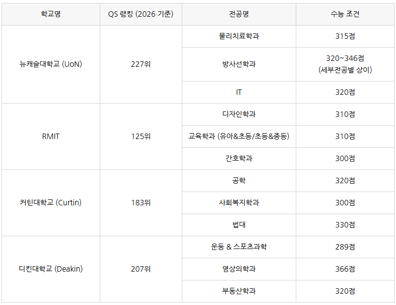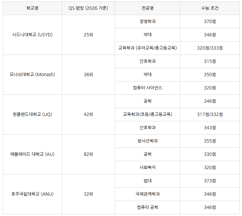 아래는 한국 수능 점수로 지원할 수 있는 호주 주요 명문대 리스트와 필요한 표준점수 조건입니다.