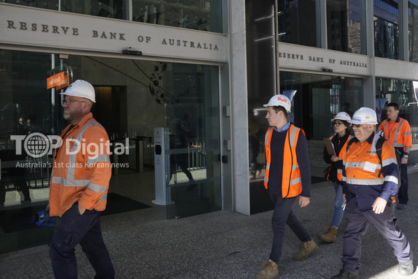 호주중앙은행 본사 앞을 지나치는 시드니 건축현장 근로자들