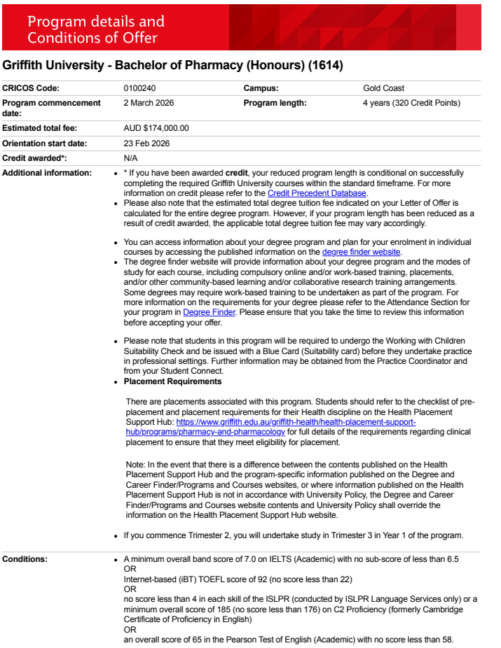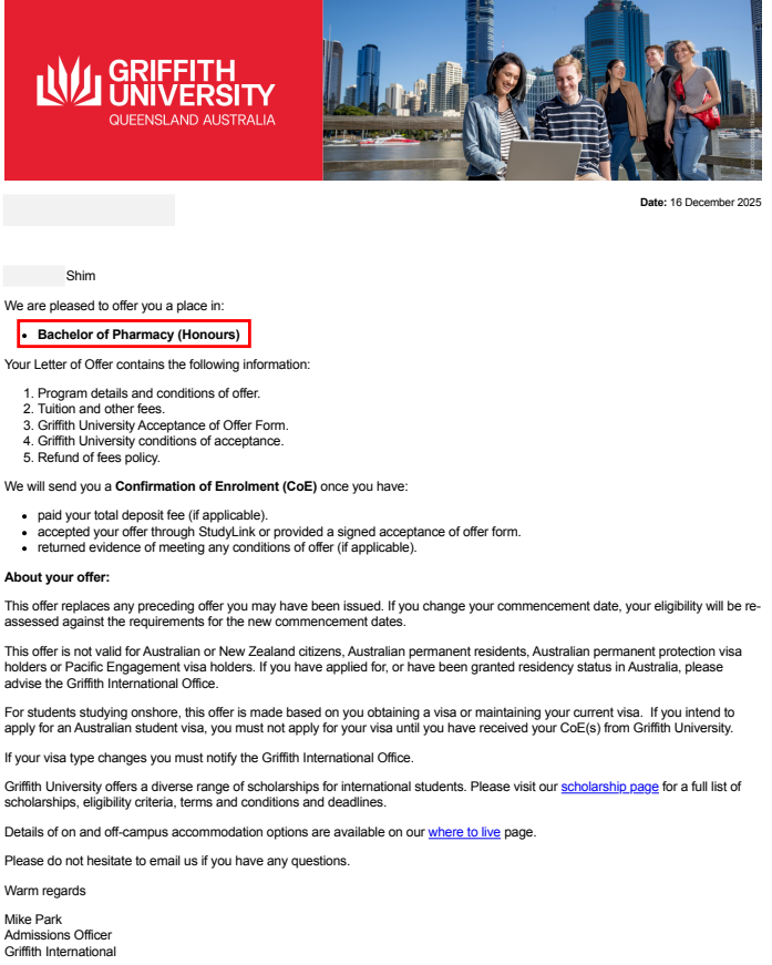 내년 2월 입학을 목표로 지원하신 그리피스대학교 약대에서, 어제 약 2주 만에 조건부 오퍼레터가 무사히 발행되었습니다.